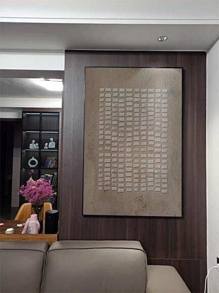 Introducing the "Sequence" a minimalist masterpiece that plays with texture and form through an arrangement of raised tiles. This oil painting, rendered in a soothing beige, features a series of tiled patterns that rise from the canvas, offering a sensory experience to the viewer. Inspired by the principles of minimal art, this piece focuses on the repetition and the subtle interplay of light and shadow, enhancing any space with its quiet yet striking presence.