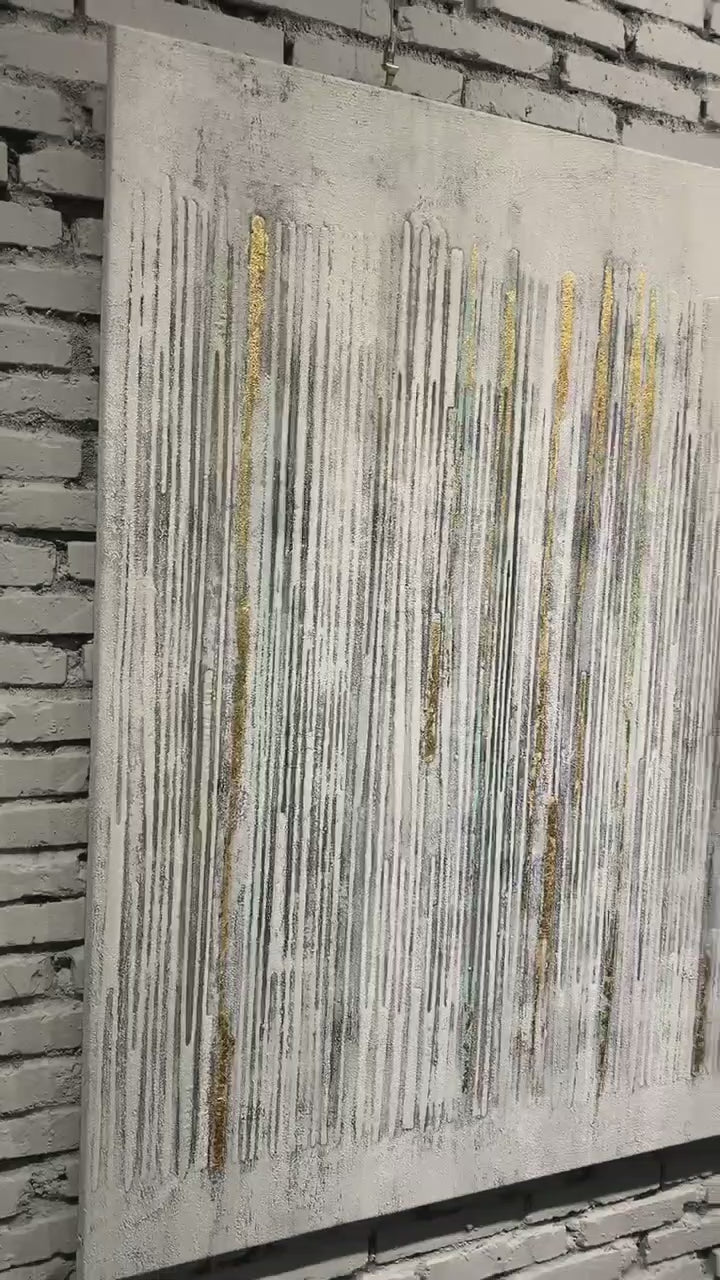 Misty Falls is a minimalist interpretation of a gentle rainfall, rendered in soft greys with touches of gold and white. The textured application of paint mimics the rhythmic patter of rain, bringing a tactile dimension to the visual experience. This piece uses the simplicity of its palette to evoke a mood of tranquility and introspection, making it an ideal choice for environments where peace and contemplation are cherished.