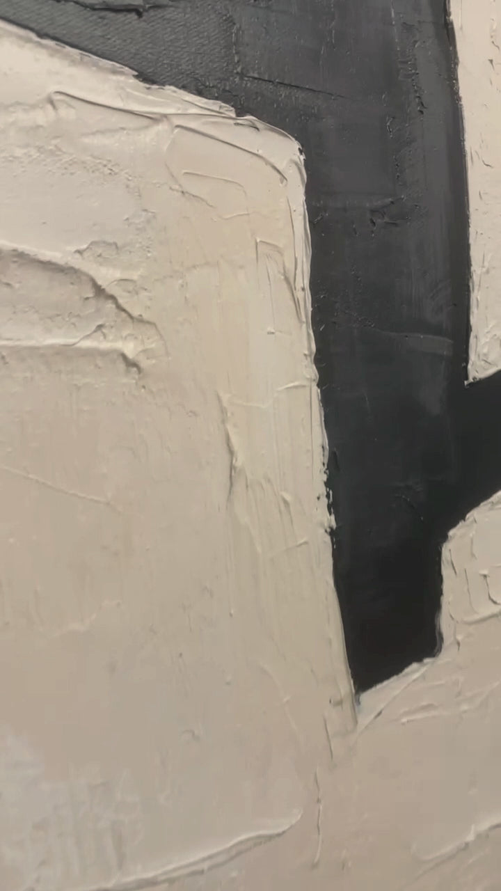 Immerse yourself in the captivating rhythm of our Duality Puzzle Oil Painting, where a beige backdrop adorned with deliberate cuts and creases sets the stage for a symphony of geometric precision. Bold black forms carve out intricate patterns—triangles, squares, and elusive numerical hints—evoking a sense of structured chaos. This artwork transcends traditional boundaries, inviting viewers to embrace the complexity of abstraction and unravel its hidden narratives.